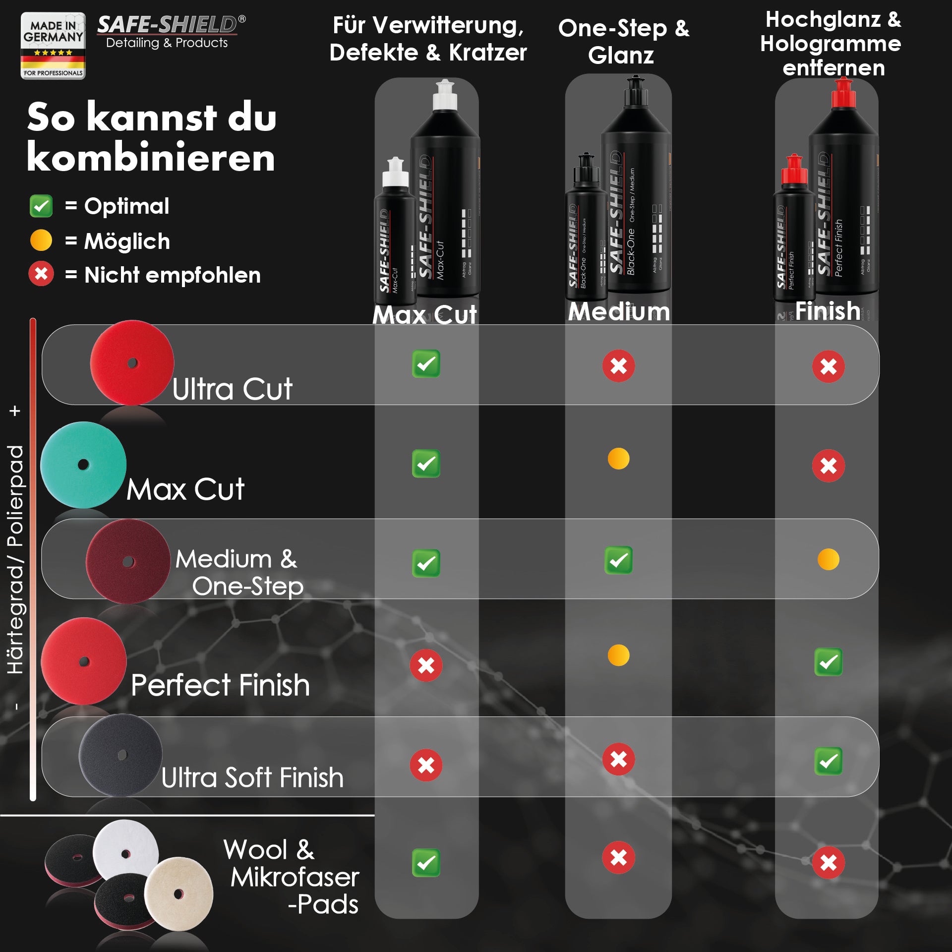 Here you will find some proven combinations. Please note: Every vehicle paint is to be assessed individually. In our combination tips, you will find detailed advice on what works better on hard or soft paints, for example.The result is influenced by the method of execution, the choice of machines, and other factors.- therefore, this section serves only as a rough and approximate guide to what can work well - based on our experience.
