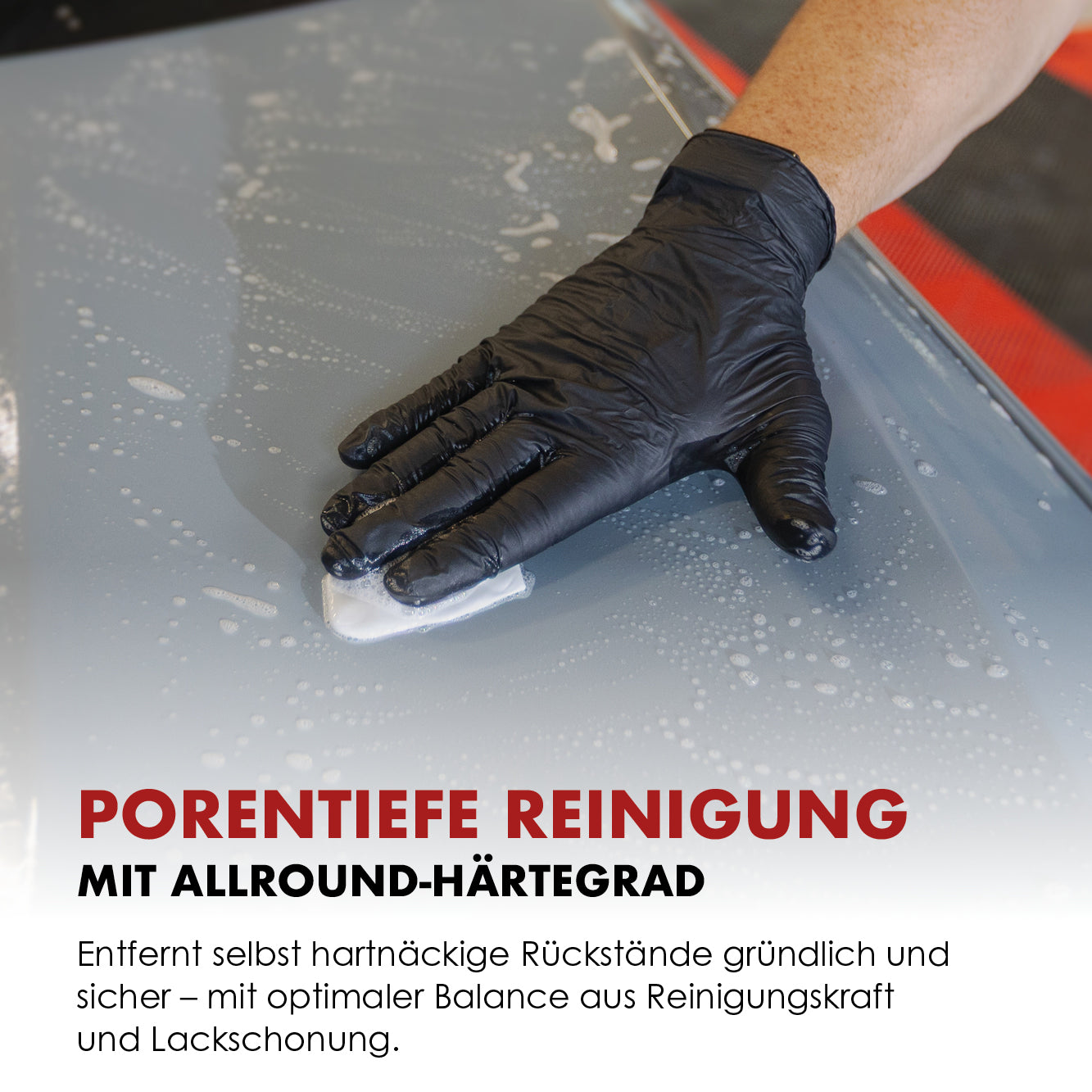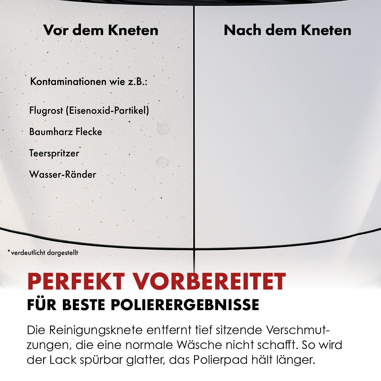 Our cleaning clay removes even deep-seated residues like rust, tar, or industrial deposits that remain after regular washing. The result: a noticeably smoother surface and visibly cleaner paintwork – ready for the next step.