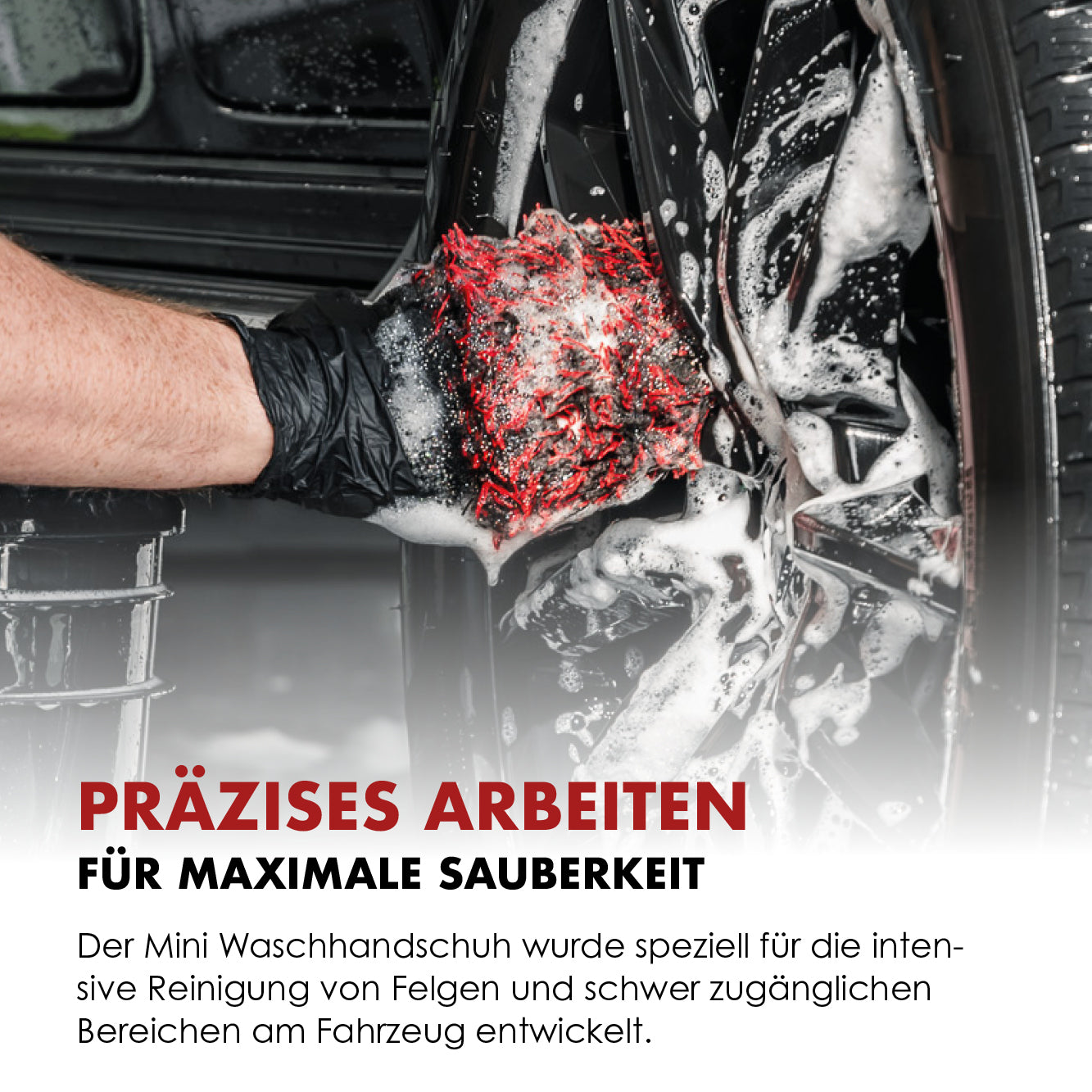 Mini fälgtvättvanten är speciellt utvecklad för att rengöra fälgar ännu mer noggrant och effektivt – även där vanliga borstar eller stora tvättvantar inte når. Genom direktkontakt med ytan har du full kontroll över varje rörelse och når enkelt smala ekrar, fördjupningar och kanter.
