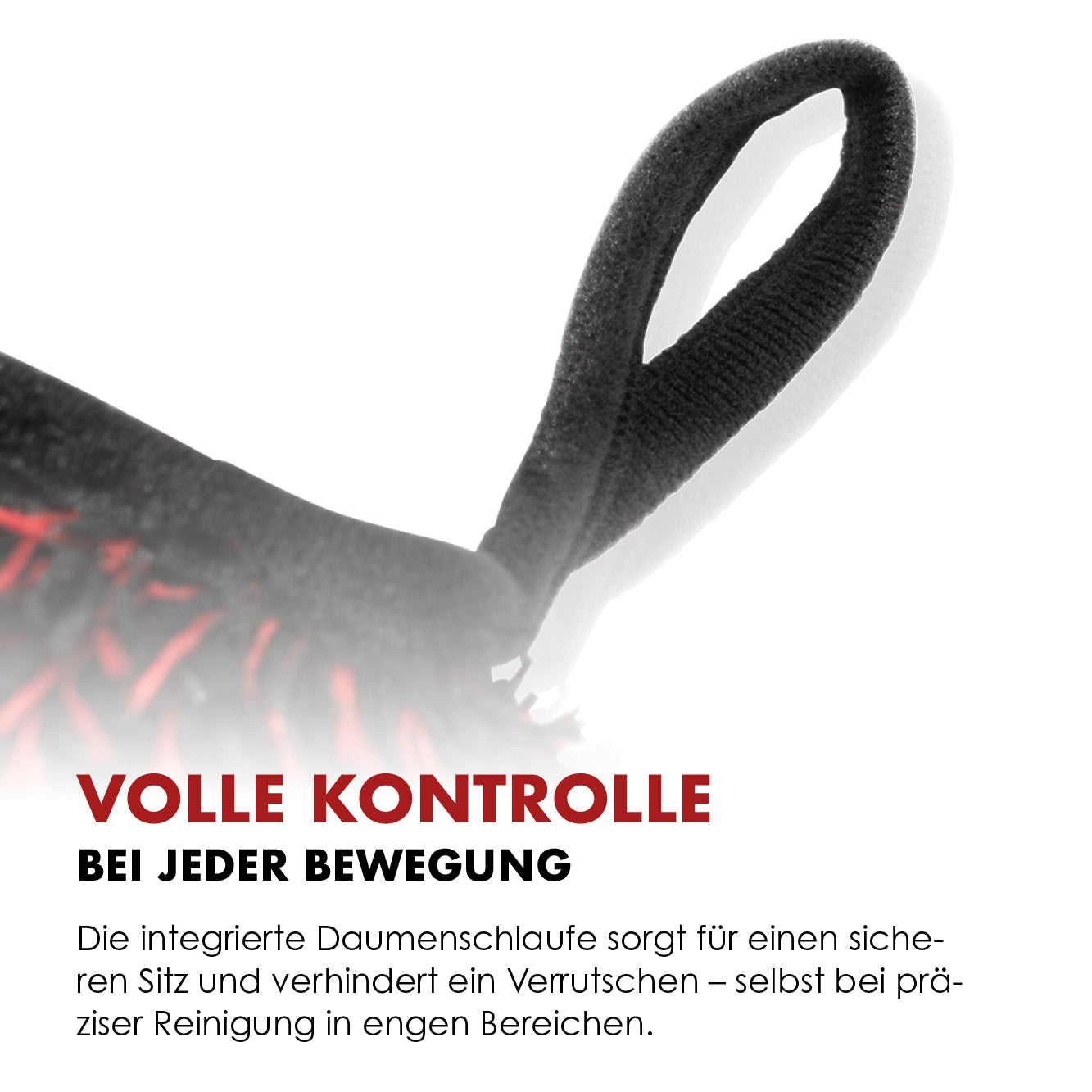 Den högkvalitativa, långfibriga mikrofibern rengör effektivt men ändå mycket skonsamt – perfekt för känsliga fälgytor. Den integrerade tumöglan ger ett säkert grepp, även med blöta händer eller vid detaljerat arbete.
