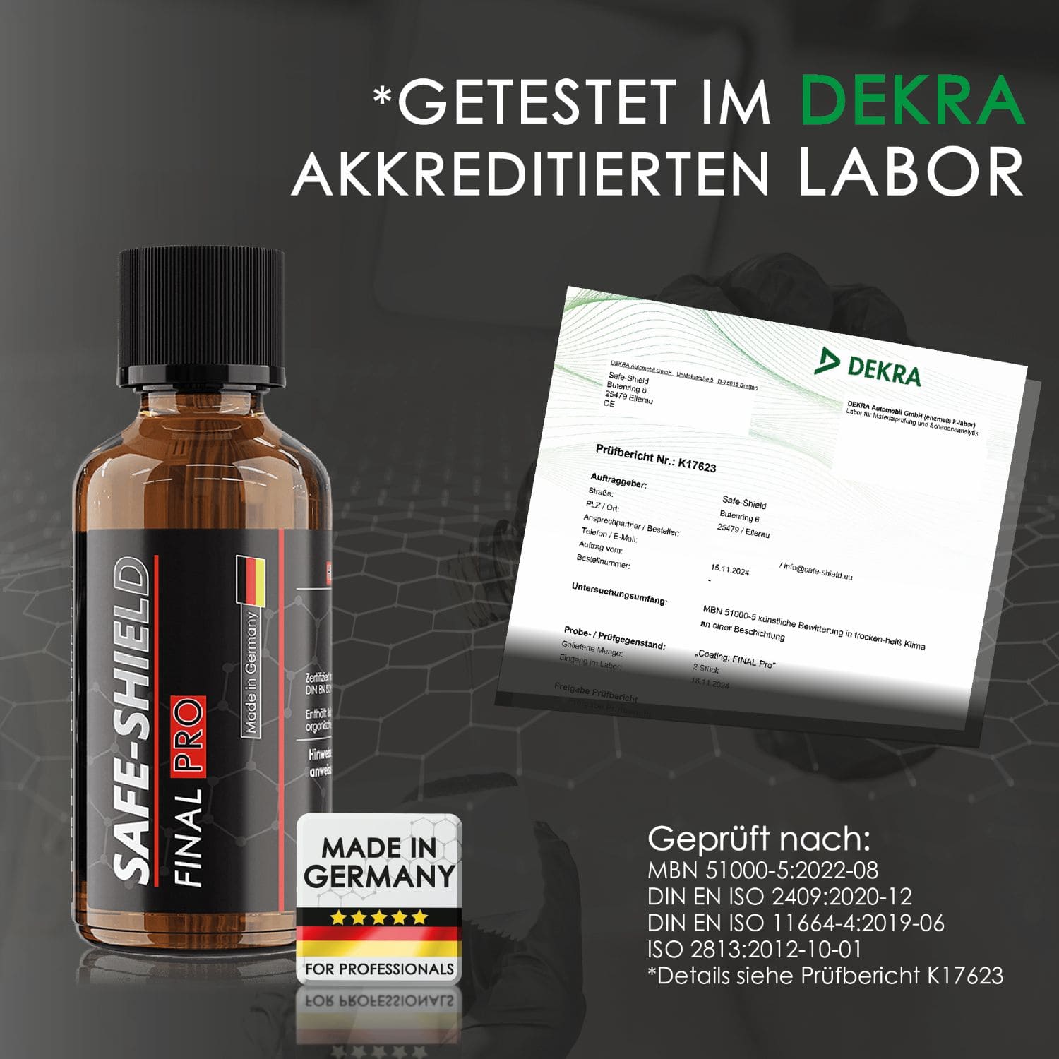 Vår Final Pro keramiskt lackskydd utvecklas, tillverkas och testas i Tyskland. Förseglingen uppfyller alla aktuella riktlinjer och erbjuder samtidigt maximal prestanda utan kompromisser.