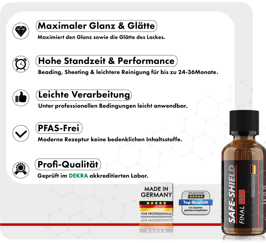 FINAL PRO garanterar dig inte bara testade och säkra ingredienser utan också maximal prestanda – från ytsläthet och intensiv glans till en imponerande hydrofobi (vattenavvisande effekt).